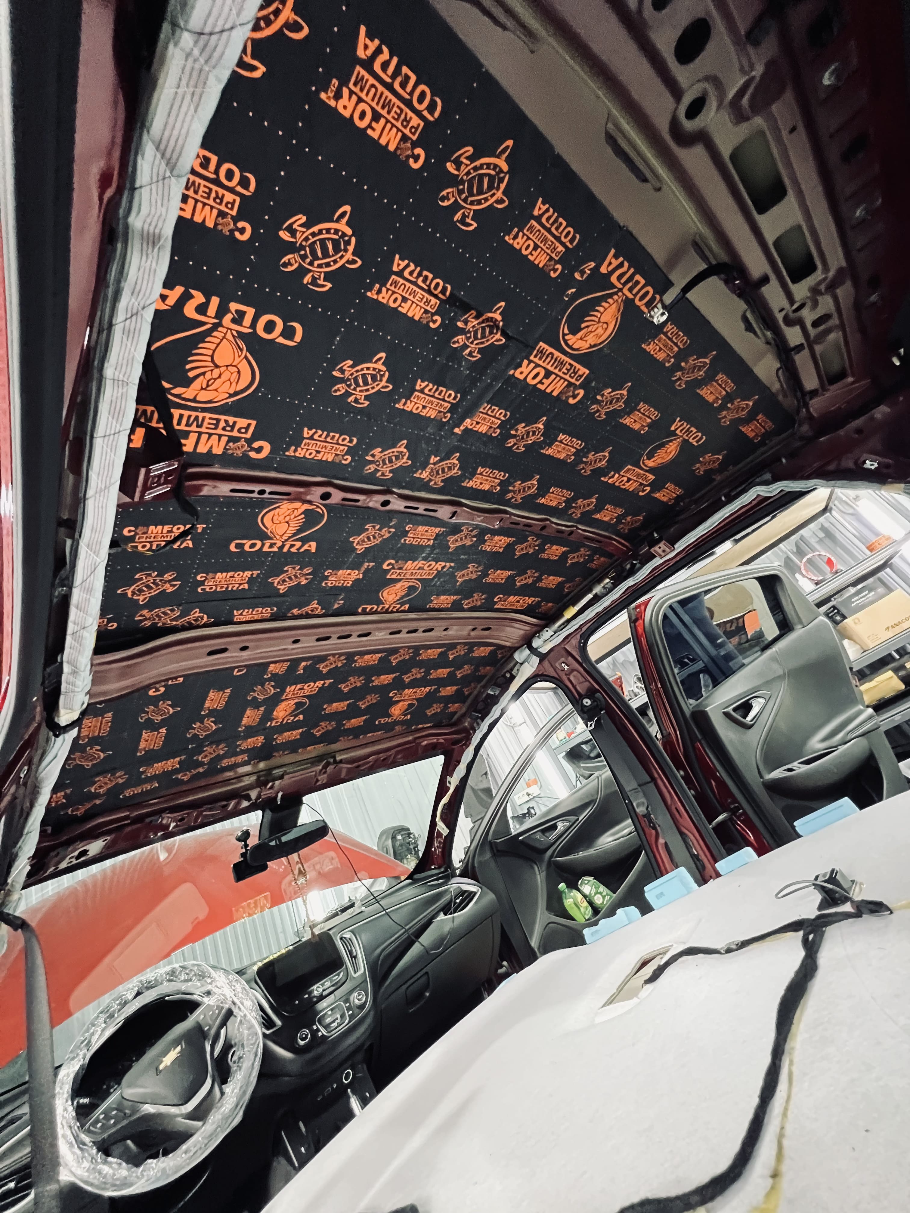 Зона над багажным отсеком также была обработана для дополнительного снижения шума. Мы применили комбинацию вибро- и шумоизоляционных материалов.