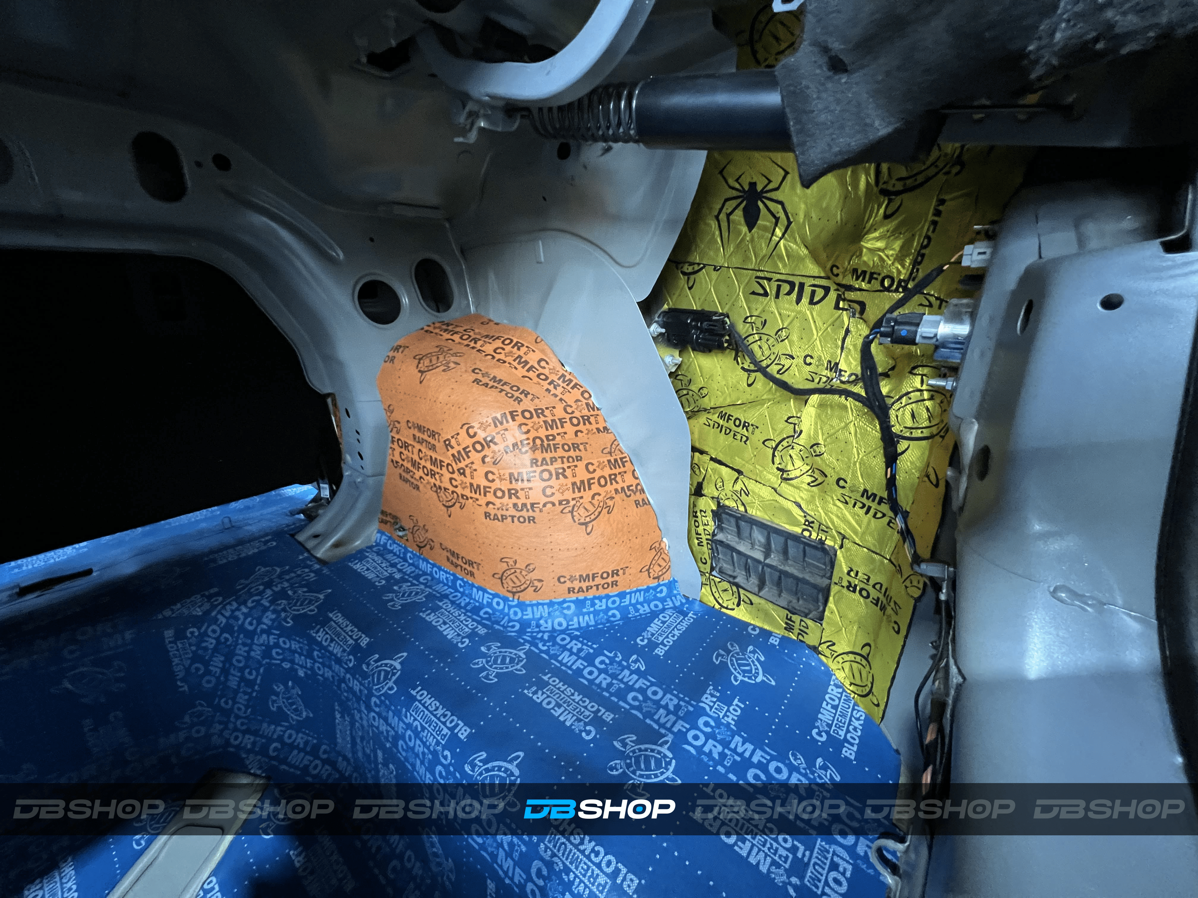 Первым слоем на дно салона и багажник нанесли виброизоляцию Comfort Mat Spider. На снимке виден готовый слой Spider, плотно наклеенный на поверхности, обеспечивающий прочную основу.